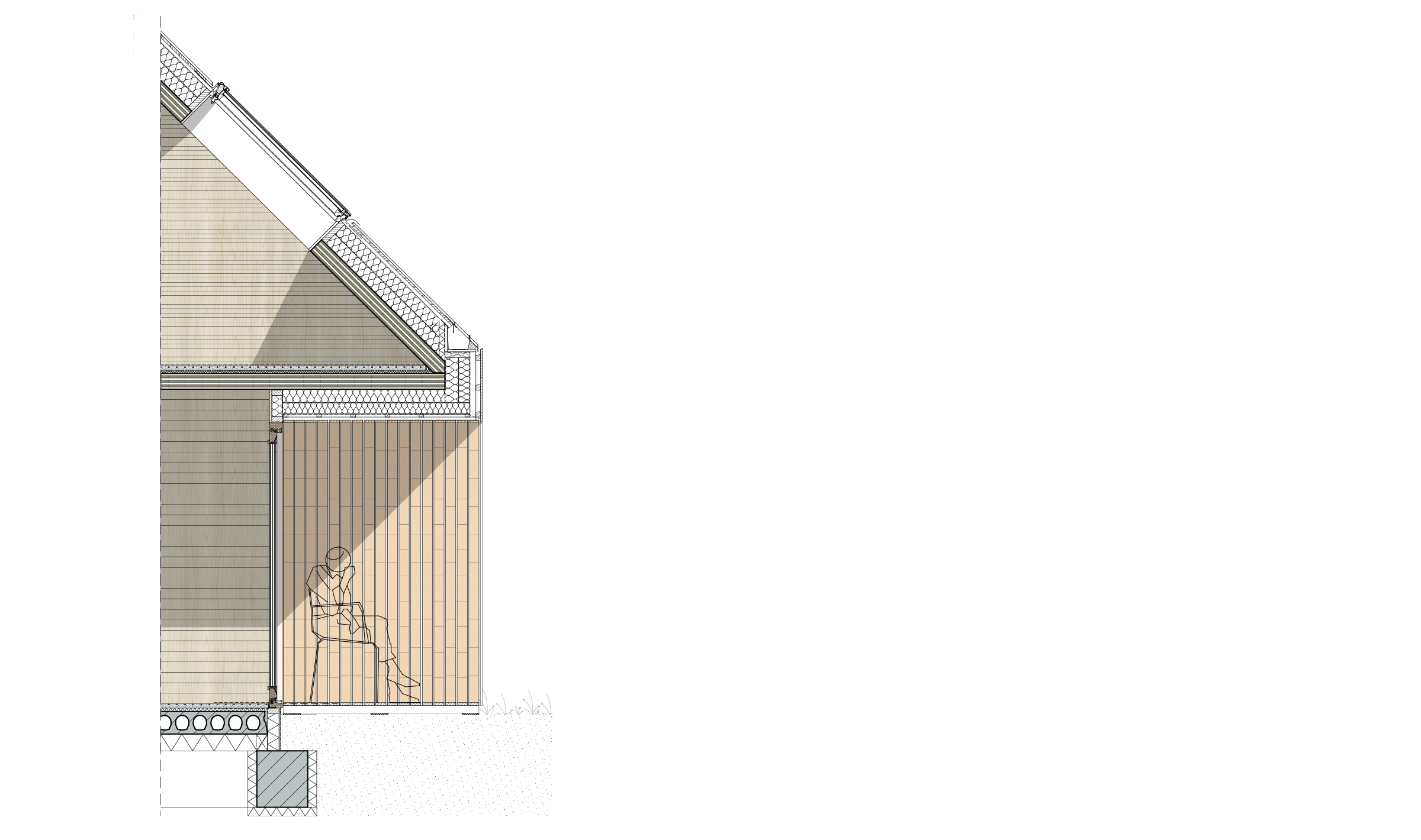 Grote glazen puien openen zich naar de uitgestrekte zichtlijnen van de polder. Het erf wordt landschappelijk en waterrobuust ingericht, met halfverharde paden en een rij knotwilgen langs de sloot. De architectuur is krachtig en ingetogen en versterkt de essentie van de schuurtypologie. Houten gevellatten en schuivende panelen filteren het licht en reguleren op een subtiele manier de privacy.